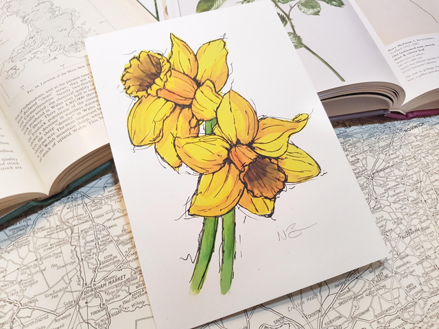 Daffodils are the national flower of Wales, so it was only a matter of time before I painted some. Not only that, but they are also beautiful in their own right. Seeing daffs popping up in the spring, bringing sunshine to the smallest patches of grass, always fills me with excitement.